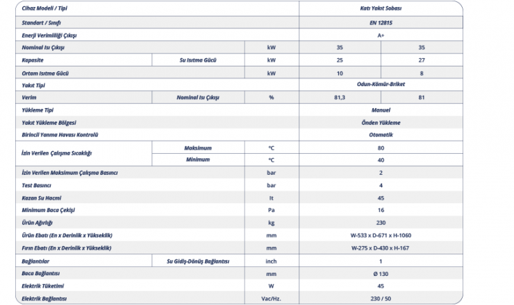 Toplam ısıl enerji üretimi 30.100 – 31.800 kcal/h arasındadır.